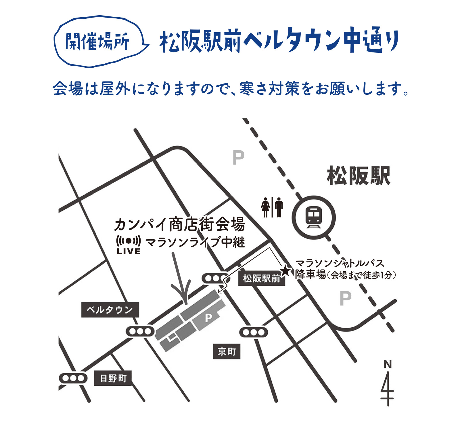 ※「みえ松阪マラソン2025公式ガイドブック」のP5、及び「カンパイ商店街2025チラシ裏」には、バス乗降所の位置がベルタウン前となっておりますが、交通安全の観点から、★の場所に変更となっております。ご注意ください。