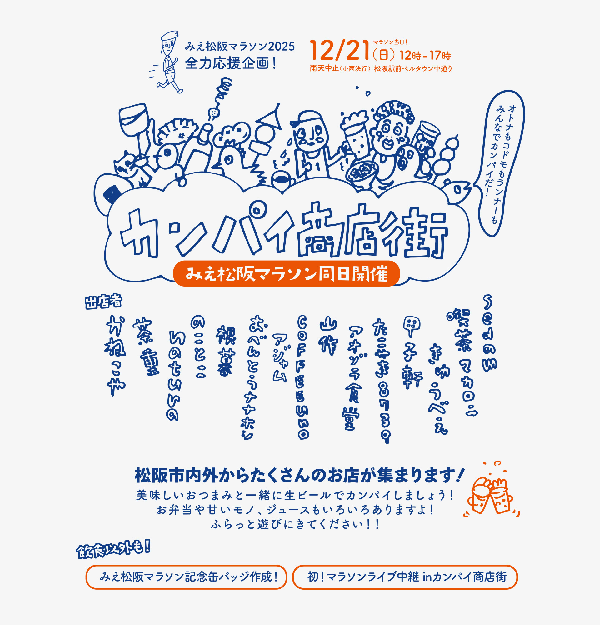 ランナーや応援する方にも楽しんでいただけるよう、松阪マラソン大会記念缶バッジや、カンパイ商店街での初のマラソンライブ中継を実施します!